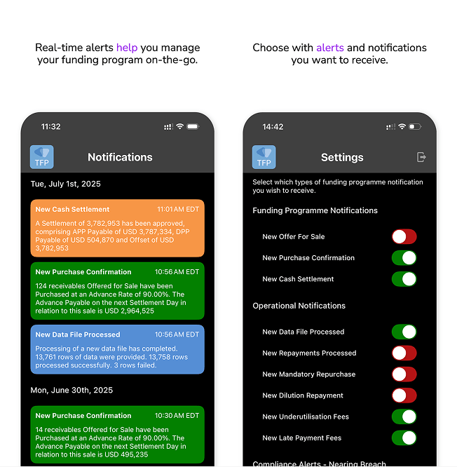 - Compliance alerts warn of impending and actual compliance and trigger threshold breaches, both of which can directly affect continuance of the funding facility.